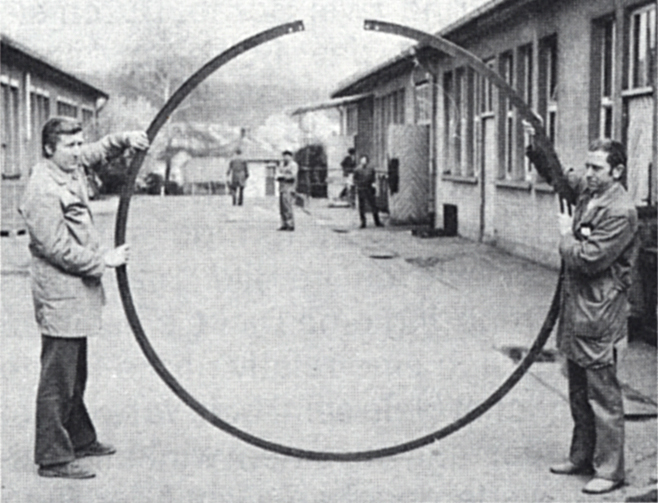 Foto de um anel tamanho "XXL" exibido pelos engenheiros de produto da Seeger. Anos 1950, Koenigstein - Alemanha.