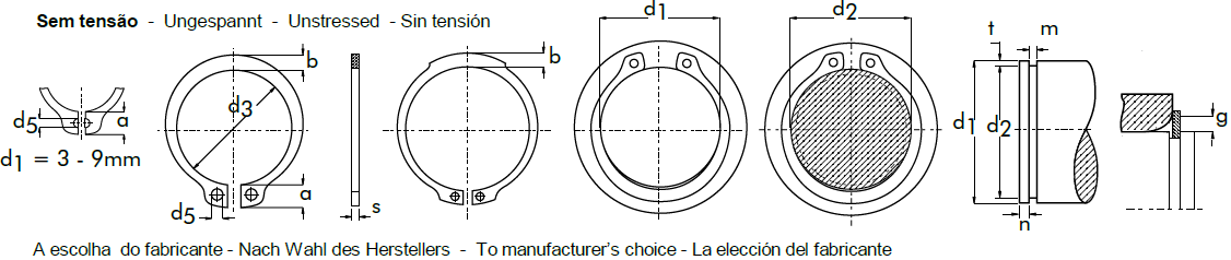 Código de referência: A3 -A1000Anéis elásticos Anelbras para eixos conforme DIN471 são os anéis mais comuns em uso no mercado. Esses anéis fornecem a solução mais favorável em relação à espessura e largura radial. Eles transferem grandes forças axiais do componente montado para a parede da ranhura.
